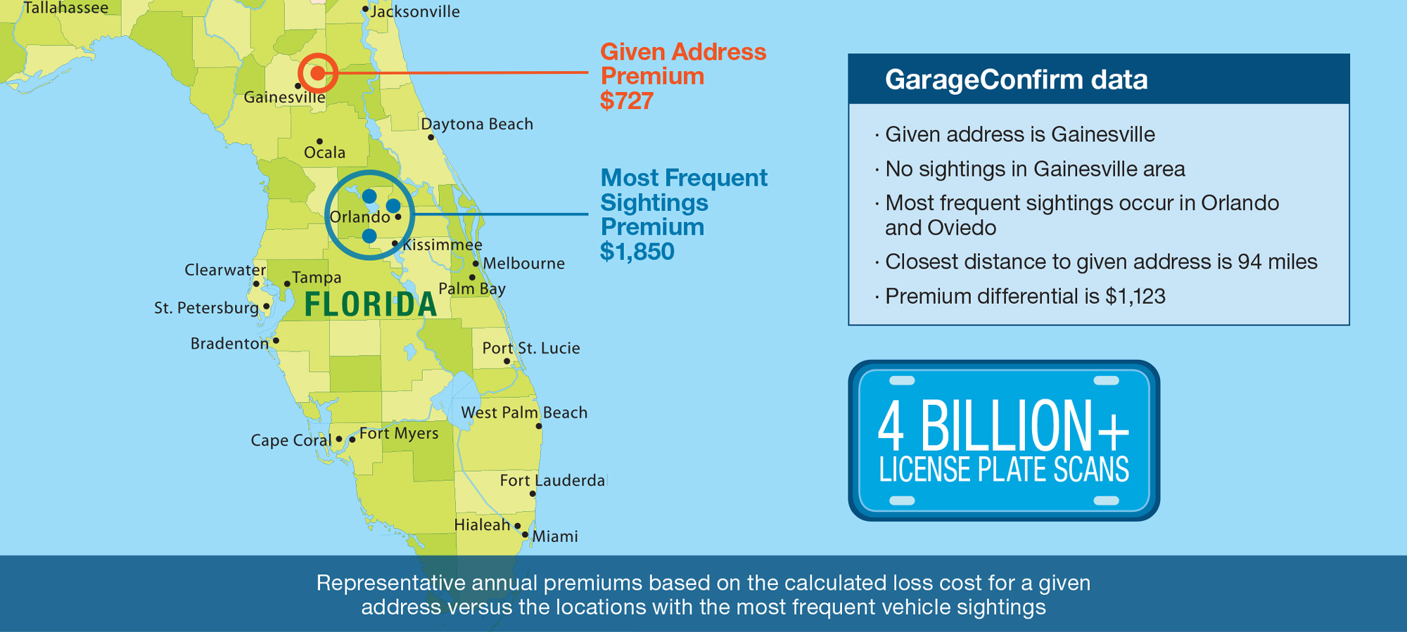 GarageConfirm tracks vehicle locations relative to listed addresses, creating location-based loss cost and premium differentials by analyzing geospatial clusters of recent sightings.