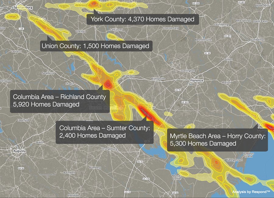 In this example, Respond estimated that the storm around Columbia, SC damaged about 8,000 homes.