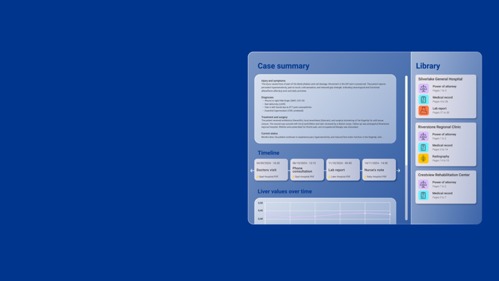 Få en tidslinje över den skadelidandes medicinska historia. Med automatisk relevansbedömning och filtrering kan du snabbt identifiera de mest relevanta händelserna. Varje händelse länkar direkt till relevanta dokumentavsnitt för snabb navigering.